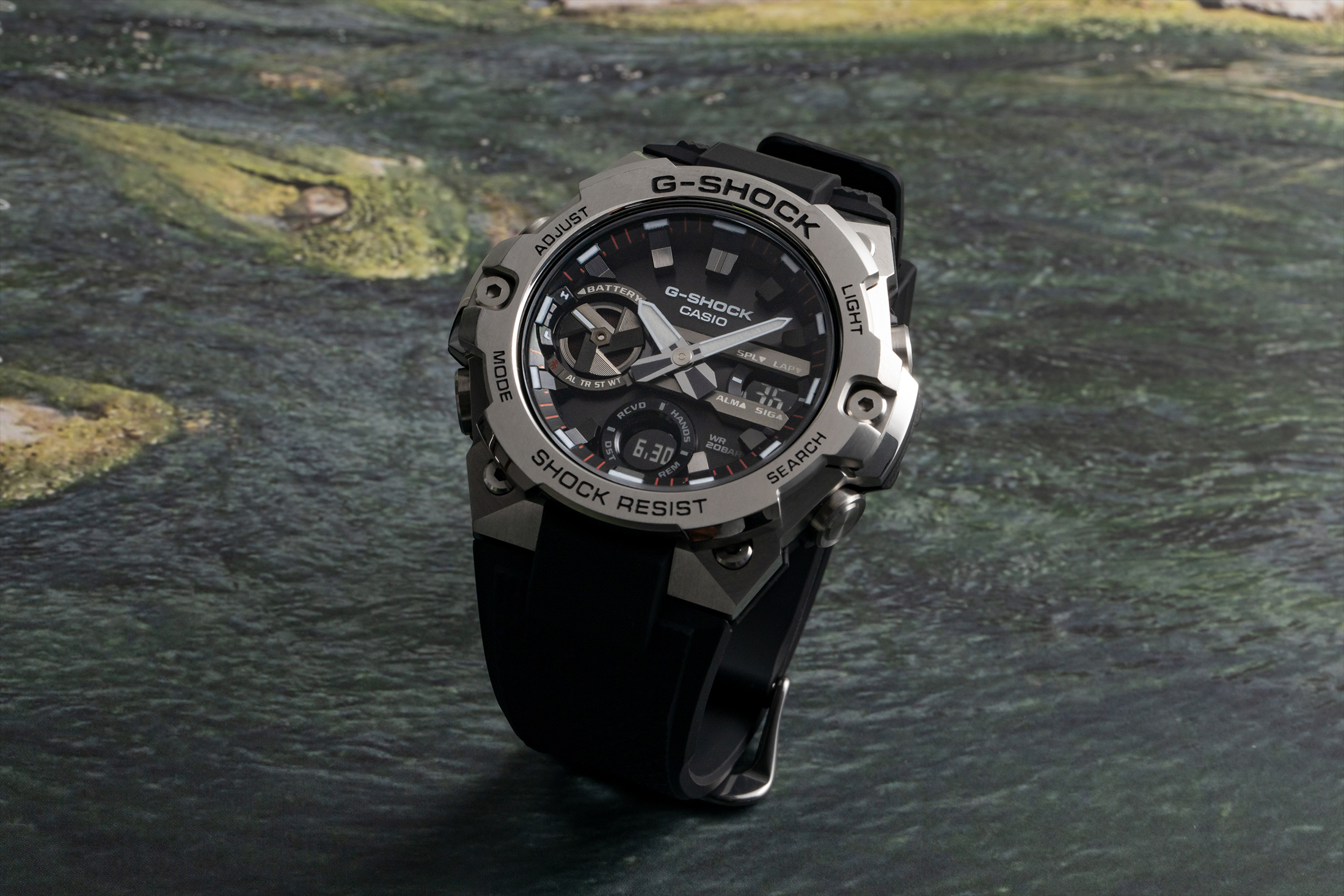 Thể thao và dễ đọc với bố cục ana-digi, G-Steel GSTB4000-1A mới là chiếc đồng hồ chạy bằng năng lượng mặt trời với dây đeo cao su, khả năng chống nước 200 mét, và bạn cũng đoán được là có kết nối Bluetooth.