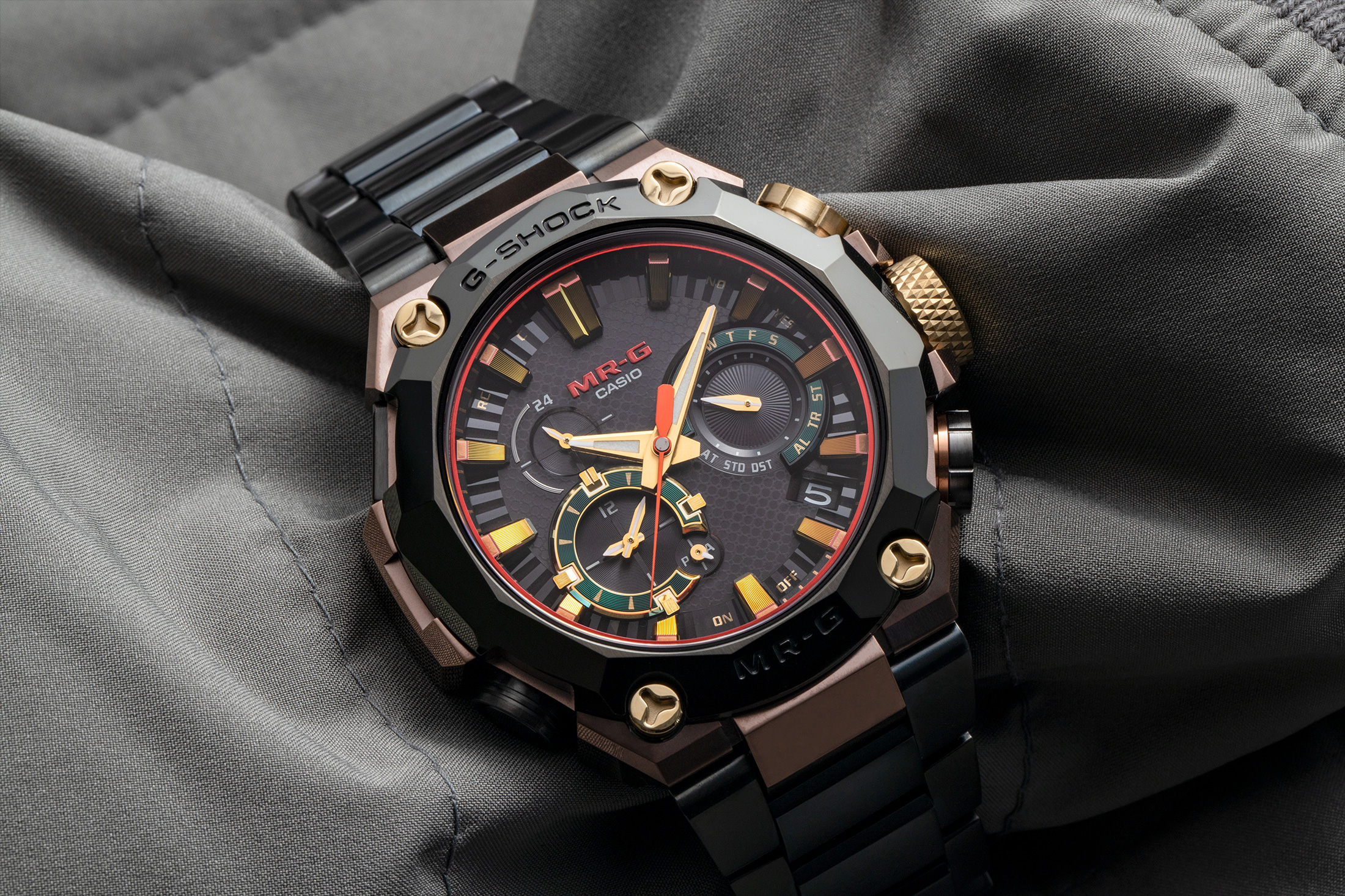 Được cho là lấy cảm hứng từ bộ giáp của Basara Samurai, MRG-B200BS-3A Hana-Basara mới được công bố đại diện cho một chiếc flagship, ngay cả đối với dòng MR-G cao cả và vô cùng ấn tượng. Với việc sử dụng DLC đầy màu sắc táo bạo nhằm gợi lên vẻ ngoài của sắt được nung nóng để tạo thành áo giáp, gờ và vòng đeo tay được làm từ Cobarion và DAT55G, cả hai đều là hợp kim kim loại cứng chuyên dụng.
